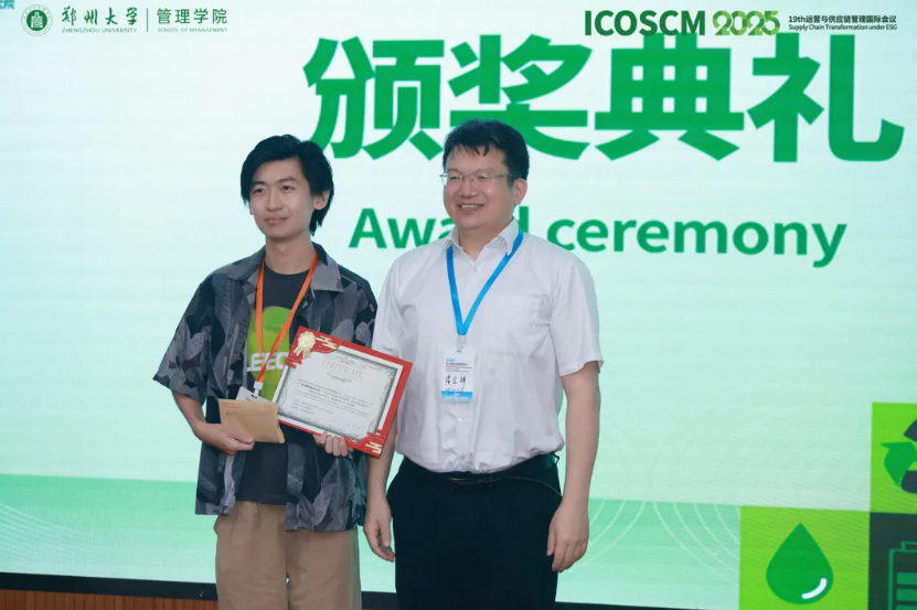 题为“From Upstream to Downstream: Unravelling Green Spillover Effects along the Supply Chain”的论文(作者Xingze Zhao)荣获“Xiande Zhao Best Paper Award”。浙江大学霍宝锋教授为该篇论文的作者颁发了证书。
